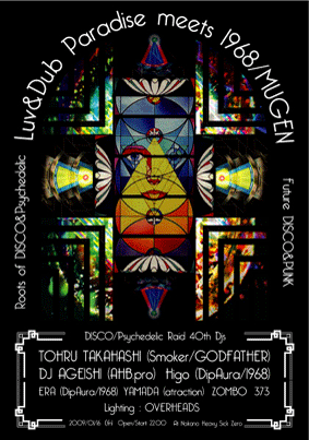 ならばOHPの達人OVERHEADSとMUGENでのDJ経験のあるDJ AGEISHIさんをくっつけて更に更にその名も「1968」と言うタイトルでこの時代の過激さを表現しまくっちょるHigoさん&eraさんにもご登場頂き更にGREENPLANETからPECOが参戦!!この国のアホアホマン伝説を再現してみようかと言う試み。。。