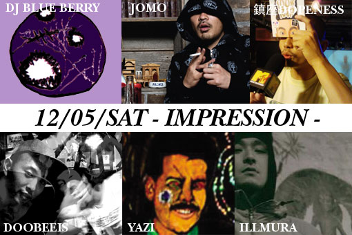 中野に移り2回目となる今回のIMPRESSIONは、旅から戻って来た鬼才、DJ BLUE BERRYが腹をえぐるような低音と頭をかき回すかのような音の波を巻き起こす。そして、今巷で話題のグループ”DOOBEEIS”が、ぶっといイカレたベーシストBOOT-GとHUMAN BEATBOXER JOMOと手を組み中野を揺らしにやって来る。なにやら今回も何かが起きそうな予感がする・・・・・